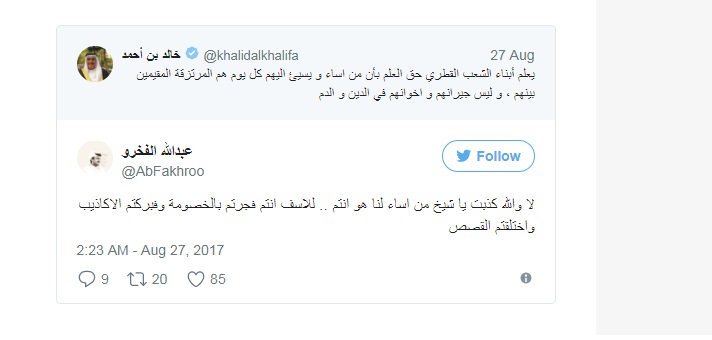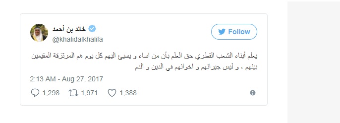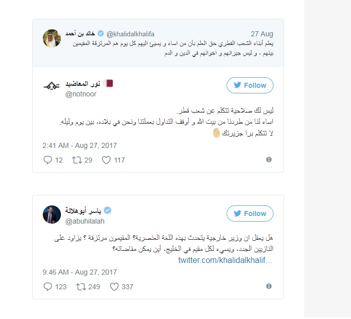 ونشر الوزير تغريدة في حسابه على "تويتر" شهدت تفاعلا كبيرا، وجهها لـ"أبناء الشعب القطري" بالقول إن من يسيء إليهم "ليس جيرانهم وإخوانهم" (دول الخليج الفارسي) بل من وصفهم بـ"المرتزقة المقيمين بينهم" حسب تعبيره.
