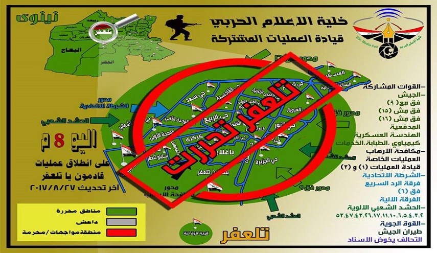 نشرت خلية الإعلام الحربي التابعة لقيادة العمليات المشتركة، الأحد، خريطة جديدة تظهر تحرير مدينة تلعفر بمحافظة نينوى من سيطرة تنظيم "داعش" بالكامل.