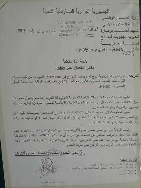 إرسالية عسكرية تم تسريبها موجهة من الناحية العسكرية الأولى بالبليدة إلى المديرية الجهوية لمصالح الصحة العسكرية تحت رقم 8331 بتاريخ 15 أغسطس 2017، وأكدت أن العطر القاتل تم اكتشافه بعدد من الدول العربية، وذكرت بعضها مثل مصر والعراق والكويت والبحرين ولبنان والسودان.