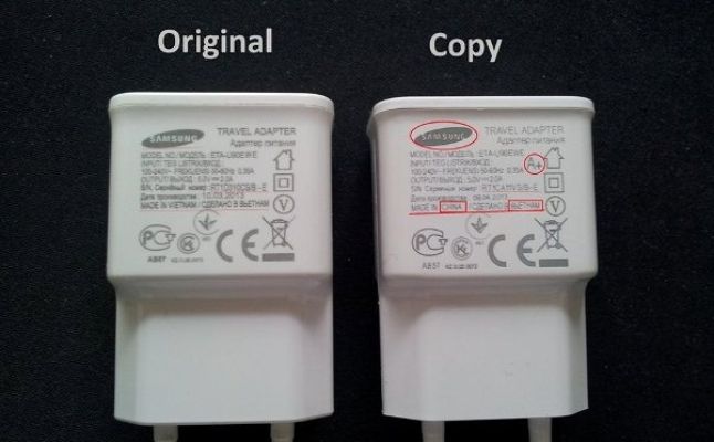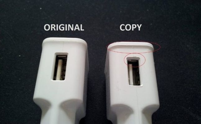 6- يختلف الشاحن التقليد في التصميم للعلبة البلاستيكيّة من عدّة نواحي أبرزها الواضحة في الصورة والتي يمكن لأي شخص تحديدها بسرعة.