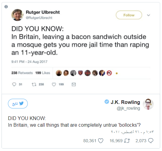 قامت الروائية البريطانية الشهيرة، جي كي رولينغ، مؤلفة سلسلة كتب هاري بوتر، بالرد على تغريدة مناهضة للإسلام، الأحد.