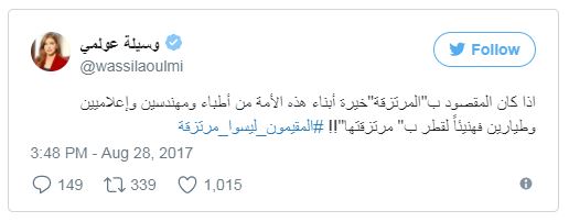 وقالت "عولمي" في تغريدةٍ لها على حسابها الرسميّ في "تويتر": "اذا كان المقصود بـ"المرتزقة" خيرة أبناء هذه الأمة من أطباء ومهندسين وإعلاميين وطيارين فهنيئاً لقطر بـ "مرتزقتها"!! #المقيمون_ليسوا_مرتزقة".