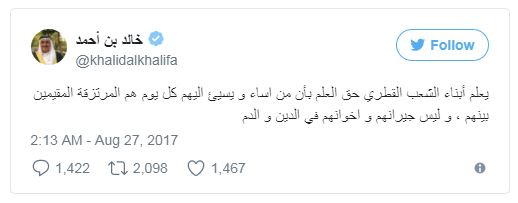 وكان "آل خليفة" قد غرّد عبر "تويتر" قائلاً:"يعلم أبناء الشعب القطري حق العلم بأن من اساء و يسيئ اليهم كل يوم هم المرتزقة المقيمين بينهم ، و ليس جيرانهم و اخوانهم في الدين و الدم".