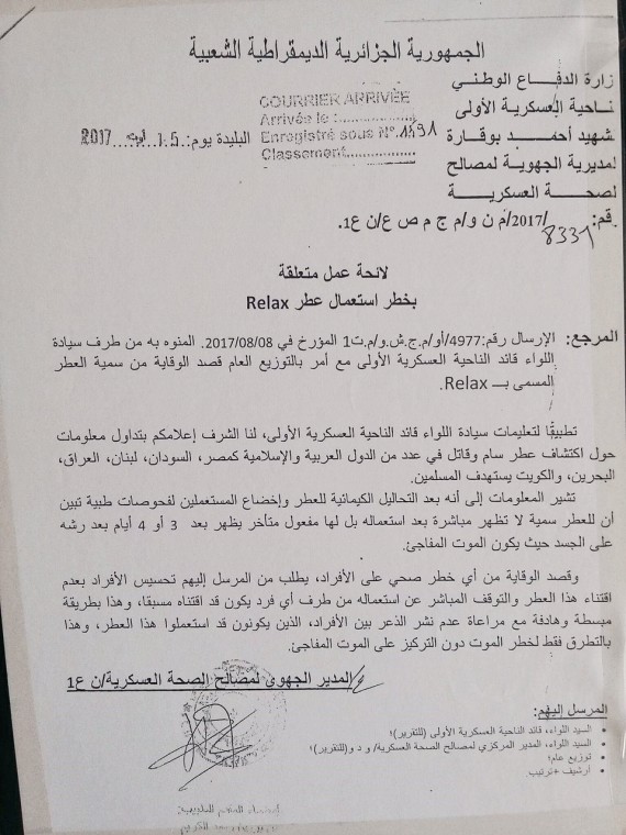 وبحسب الوثيقة المنسوبة لوزارة الدفاع الجزائرية، المؤرخة في ( 17 اغسطس/ آب 2017)، والصادرة عن المديرية الجمهوية للصحة العسكرية التابعة للناحية العسكرية الأولى، فإن "المعلومات المتوفرة أفادت بأن التحاليل بينت أن للعطر سمية لا تظهر عند استعماله مباشرة بل لها مفعول متأخر يظهر بعد 3 أو 4 أيام من رشه على الجسد حيث يكون الموت المفاجئ"، وفق ما نقله هافنغتون بوست.