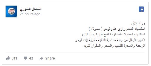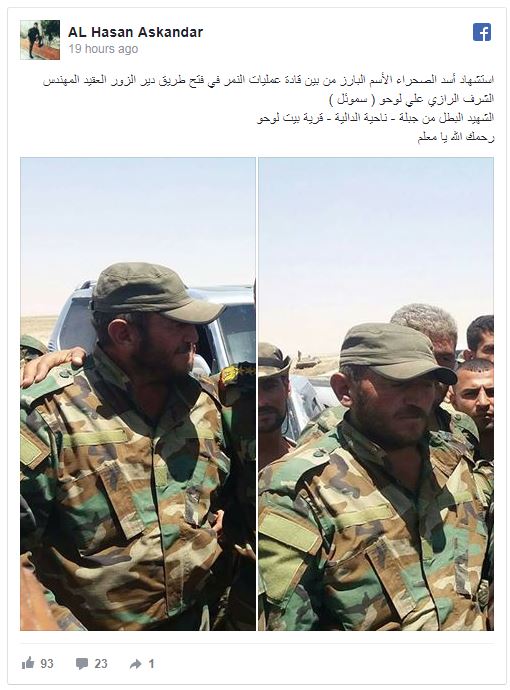ذكرت مصادر في سوريا استشهاد القائد العسكري البارز في القوات السورية، المقدم رازي علي لوحو، المعروف أيضا باسم "أسد الصحراء"، بمعارك مع تنظيم "داعش" في ريف الرقة الجنوبي.