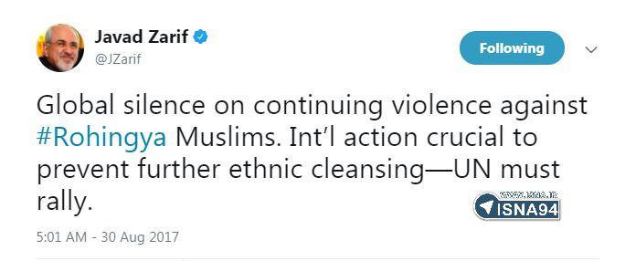 وفي تغريدة على حسابه الرسمي على موقع تويتر أكد ظريف على ضرورة اتخاذ خطوات في المجتمع الدولي لمنع المزيد من التطهير العرقي والقومي مشددا على ضرورة قيام الأمم المتحدة بمهامها في هذا المجال.