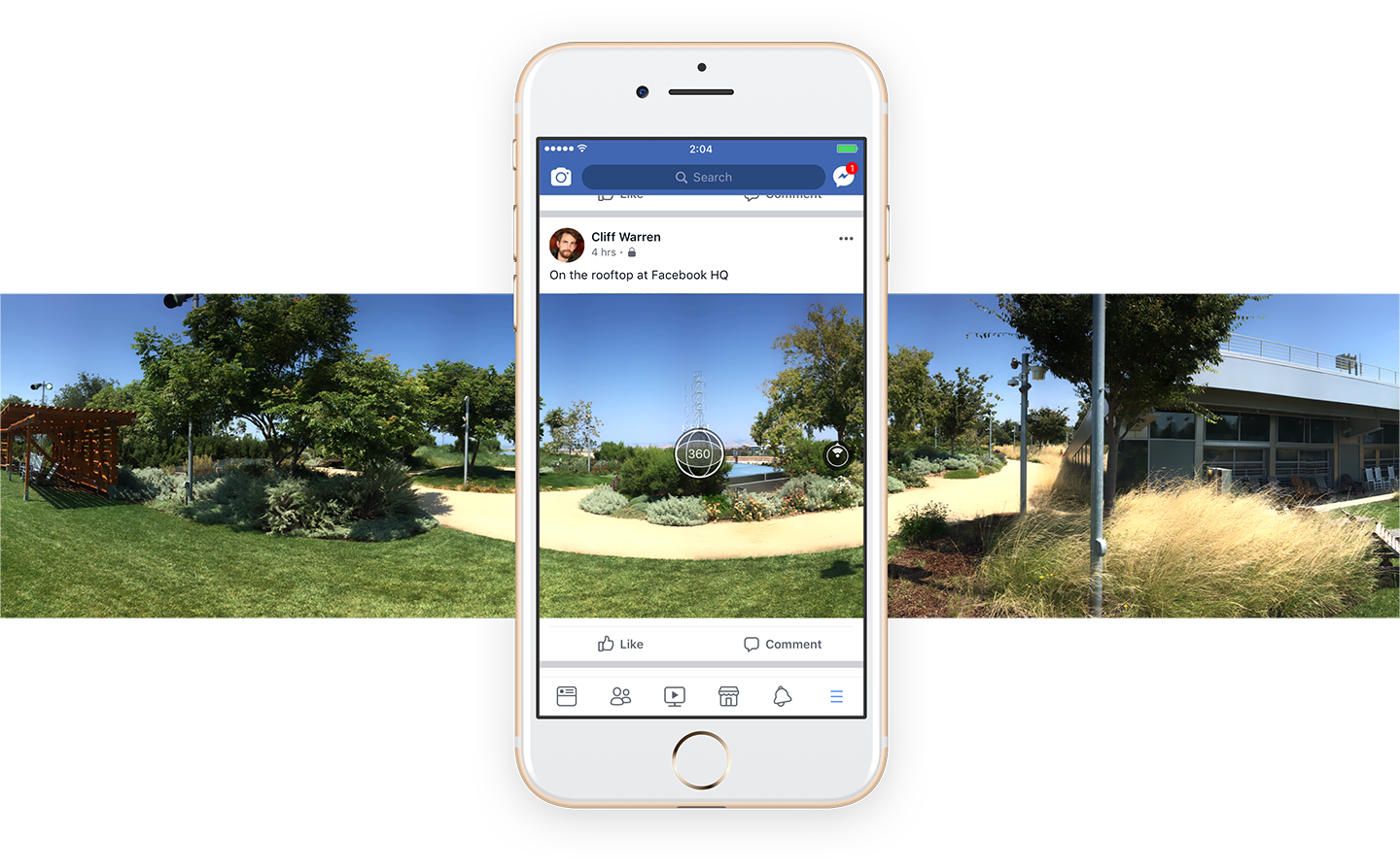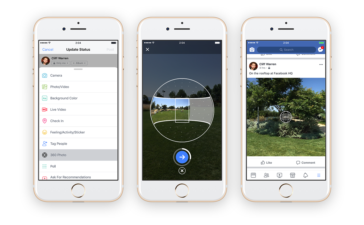 ويستطيع مستخدمو "فيسبوك" التصوير بتقنية 360 درجة دون الحاجة لكاميرا خاصة، من خلال تطبيق الهواتف الذكية، واستعمالها كصورة غلاف لحسابهم الخاص، مع إمكانيّة الإشارة للأصدقاء في تلك الصورة.
