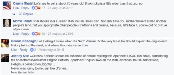 أمر آخر أثار استياء متابعي أوبريان، هو نشره وصفة لأكلة "الشكشوكة"، التي قال إنها إسرائيلية، فيما ردَّ عليها المتابعون بأنها أكلة معروفة من أصول شمال إفريقية عربية، تُحضَّر بالبيض والطماطم، عُرفت قبل الاعلان عن دويلة "إسرائيل" ذاتها.