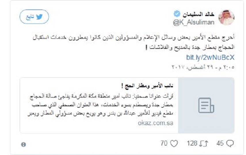 وتابع، قائلا في مقال نشره بصحيفة "عكاظ" السعودية "زيارة الأمير أحرجت بعض وسائل الإعلام والمسؤولين، الذين كانوا يمطرون خدمات استقبال الحجاج في مطار جدة، بالمديح والأرقام القياسية في سرعة الإنجاز وسلاسة الحركة وجودة الخدمة".