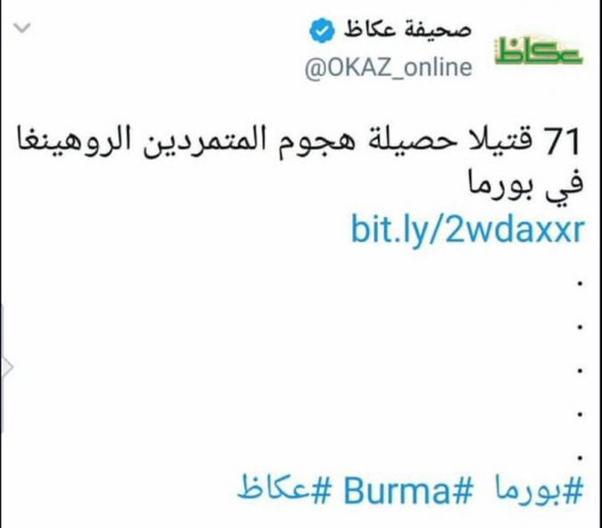 وجاء خبر الصحيفة تحت عنوان: «71 قتيلا حصيلة هجوم المتمردين الروهينغا في بورما» قبل أن تقوم بحذفه.