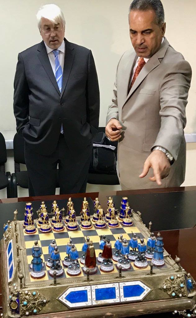 ونشرت السفارة صورا لرقعة الشطرنج والقطع المطعمة بالأحجار الثمينة، والتي تعكس جانبا من البذخ الذي كان يتمتع به الدكتاتور صدام (اعدم في صبيحة عيد الأضحة الموافق 30 ديسمبر 2006) خلال حكمه للعراق، فيما الشعب العراقي يعيش ويلات الحصار التي سببتها نزواته وحروبه العبثية.