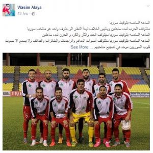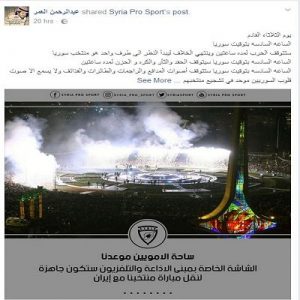 واللافت التعليقات والبوستات التي انتشرت على مواقع التواصل الاجتماعي، وجاء فيها انه في وقت المباراة ستتوقف الحرب وينتهي الخلاف بين السوريين ولا تسمع الا اصوات السوريين في تشجيع منتخبهم.