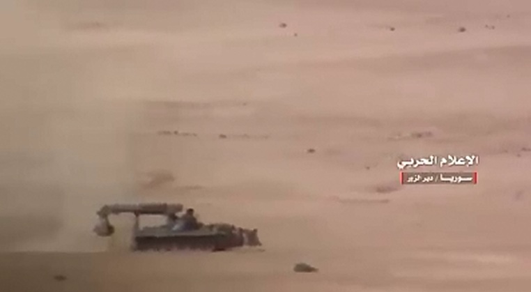 سوريا_الكوثر: مشاهد من استهداف قوات الجيش السوري والحلفاء المتقدمة لفك الحصار عن مدينة دير الزور باتجاه الفوج 137 لمسلحي تنظيم داعش وتدمير عدد من الياتهم قبل التقاء القوات في محيط الفوج.