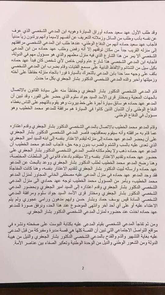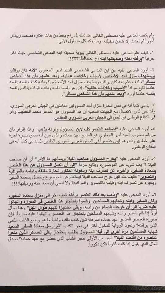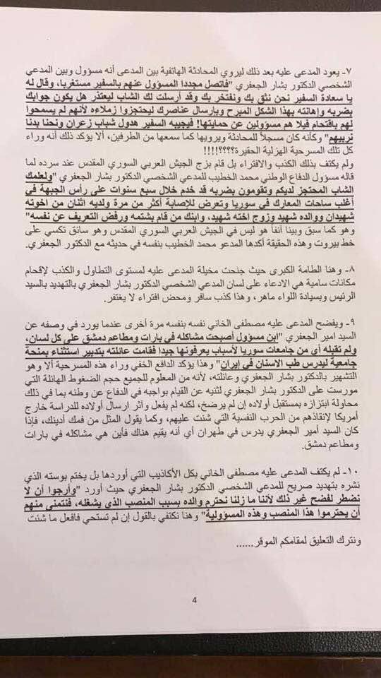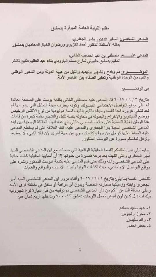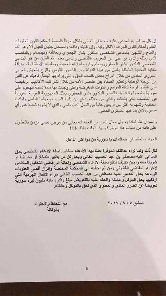وقال الموقع "قام بشار الجعفري أمس الثلاثاء 5/9/2017 بتقديم ادعاء شخصي مباشر أمام النيابة العامة بدمشق بمواجهة الممثل مصطفى الخاني وذلك رداً على "البوست" الذي نشره الأخير على صفحته الخاصة في موقع التواصل الاجتماعي "الفايسبوك" يوم الأحد بتاريخ 3/9/2017 بجرم "القدح والذم والتشهير والتهديد" وفقاً لأحكام قانون العقوبات العام وأحكام قانون الجرائم الالكترونية".