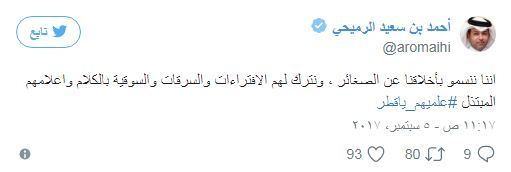 فيما رد مدير المكتب الإعلامي في وزارة الخارجية القطرية، أحمد بن سعيد الرميحي، على الأغنية عبر تغريدة في حسابه الرسمي على موقع "تويتر"، استخدم فيها وسم "علميهم يا قطر".