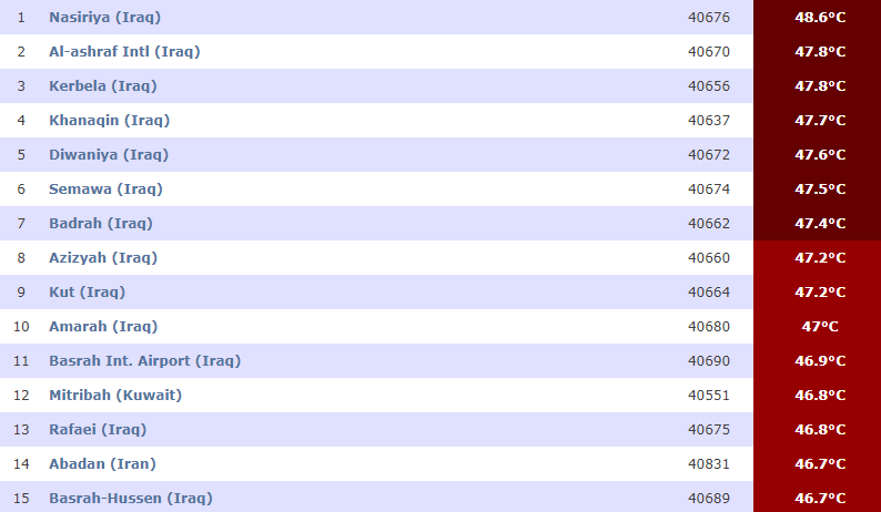 وبين الجدول ان "مدينة الناصرية احتلت المرتبة الاولى باعلى درجات الحرارة بالعالم حيث سجلت درجات الحرارة العظمى فيها 48.6 درجة مئوية تليها بالمرتبة الثانية محافظة النجف الاشرف بدرجة حرارة بلغت 47.8 درجة مئوية، ومن ثم تاتي بالمرتبة الثالثة محافظة كربلاء بدرجة حرارة بلغت 48.7 درجة مئوية، ومن ثم تاتي بالمرتبة الرابعة قضاء خانقين بديالى بدرجة حرارة بلغت 47.7 درجة مئوية.