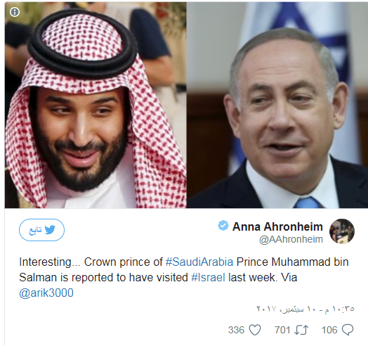 ونقلت إذاعة "صوت إسرائيل أيضا" خبر زيارة الأمير السعودي إلى الكيان المحتل غير أنه ظل اسم الأمير مجهولا، إلا أن عددا من الصحف والمواقع الإسرائيلية رجحت أن يكون الأمير محمد بن سلمان ولي العهد السعودي هو من قام بالزيارة السرية للكيان الغاصب وألتقى رئيس الوزراء الإسرائيلي بنيامين نتنياهو.