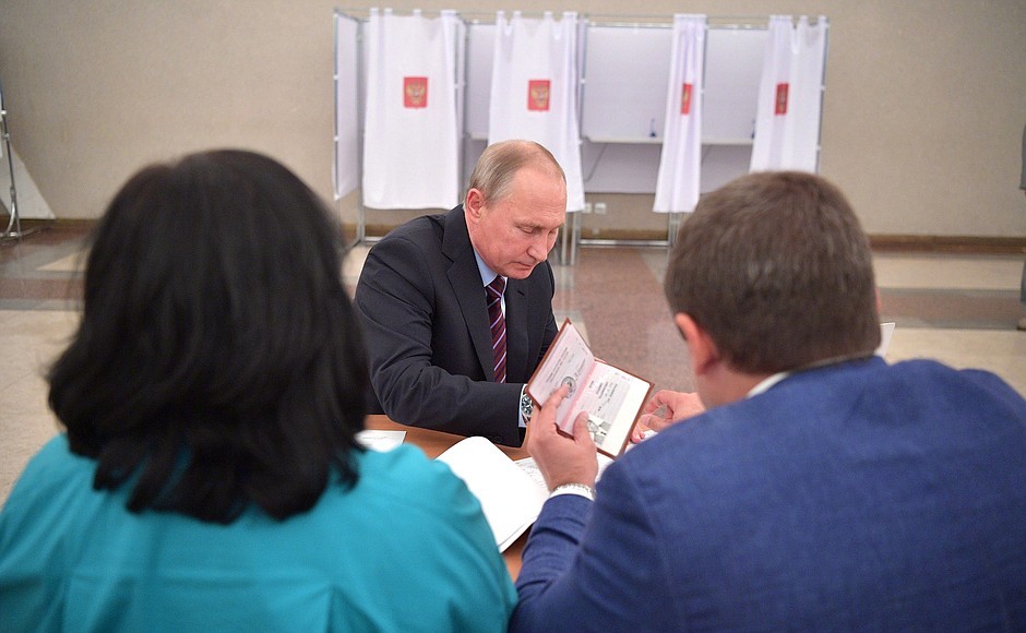 ويظهر بوتين في الصورة أثناء التصويت في أحد مراكز الاقتراع بمدينة موسكو التي انتخبت أمس الأحد أعضاء المجالس البلدية. ويجلس بوتين أمام مكتب موظف فتح وثيقة الهوية الخاصة بالرئيس ليتأكد من هويته، حسب القواعد.