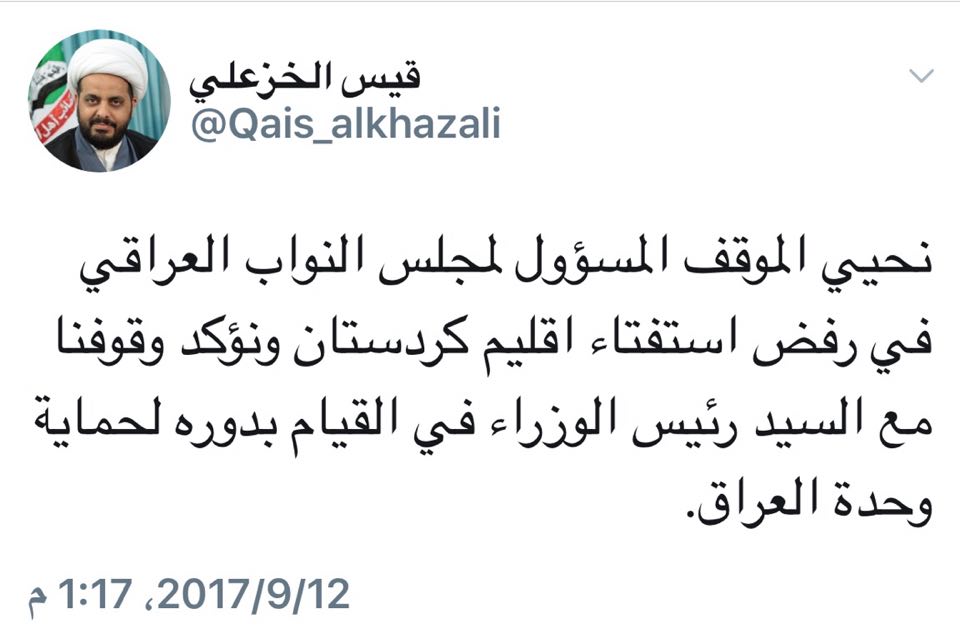 وكتب الخزعلي في صفحته الشخصية على موقع التواصل الاجتماعي تويتر، اليوم (12 ايلول 2017)، "نحي الموقف المسؤول لمجلس النواب العراقي، في رفض استفتاء كردستان العراق.