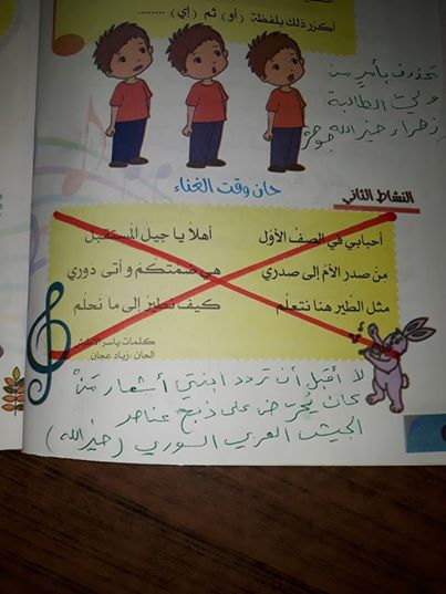 كما اتخذت الوزارة قرارا باستبدال القصيدة الواردة في درس "يومي الأول" في كتاب التربية الموسيقية للصف الأول الصفحة /6/ بقصيدة "وطني" للشاعر سائر إبراهيم.