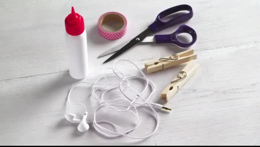 أما حل هذه الأزمة فبسيط جدا، إذن تحتاج مشبكين خشبيين لصنع حامل السماعات الذي يمنع أسلاكها من التشابك.