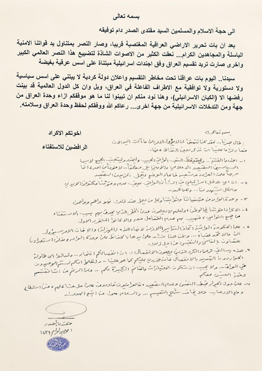 واعتبر السيد الصدر في رسالته التي اطلعت عليها قناة الكوثر، الانفصال "انتحاراً" ودعاهم إلى الحوار، مطالباً الحكومة العراقية بالحفاظ على وحدة البلاد، فيما حذر "إسرائيل" من التدخل في الشأن العراقي.