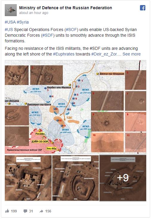 وجاء في بيان الوزارة: "بمساعدة الصور الجوية التي التقطت في الفترة الممتدة من 8 إلى 12 سبتمبر 2017 في مناطق انتشار مسلحي "داعش"، وقد وثق عدد كبير من العربات المدرعة للولايات المتحدة مثل" هامر "، التي تستخدمها القوات الخاصة للولايات المتحدة الأميركية ".