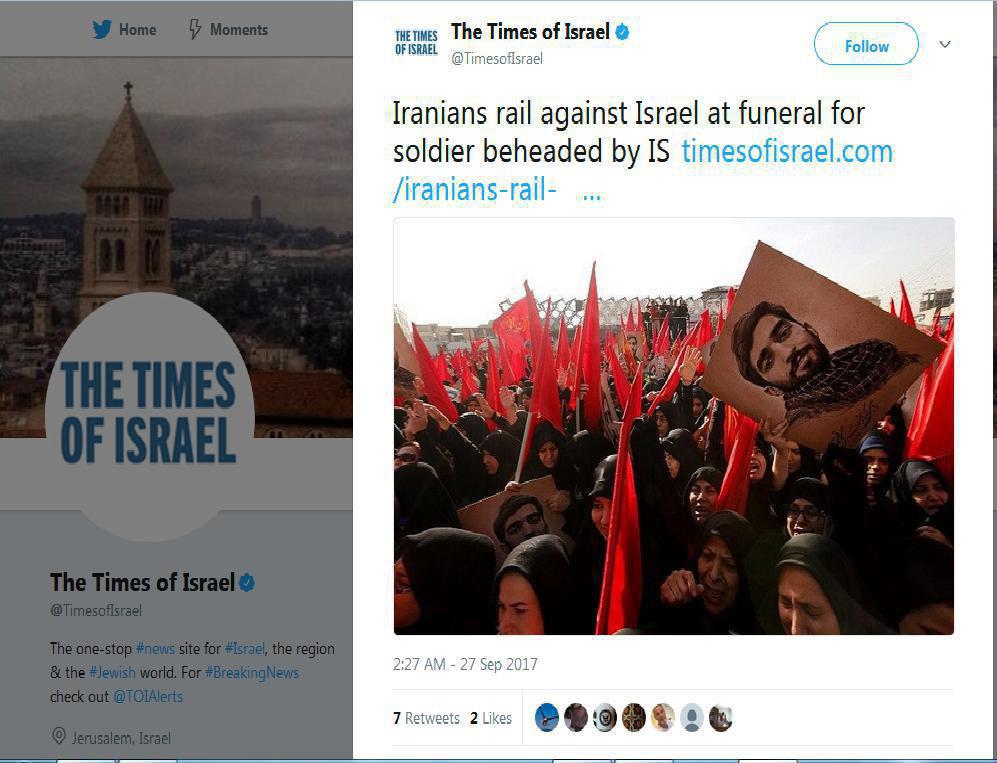 وكشفت الصحيفية الصهيونية " تايمز اسرائيل " بان الشعب الايراني شيع اليوم في طهران جثمان الشيهد محسن حججي الذي ذبحه داعش على الحدود السورية العراقية، ورفع المشيعون شعار، الموت لاسرائيل، لان حقيقة داعش لاتنطلي على الشعب الايراني، فانه يدرك جيدا من ان داعش وبقية العناصر المسلحة صنيعة اسرائيل واميركا والسعودية الوهابية.