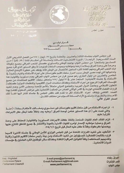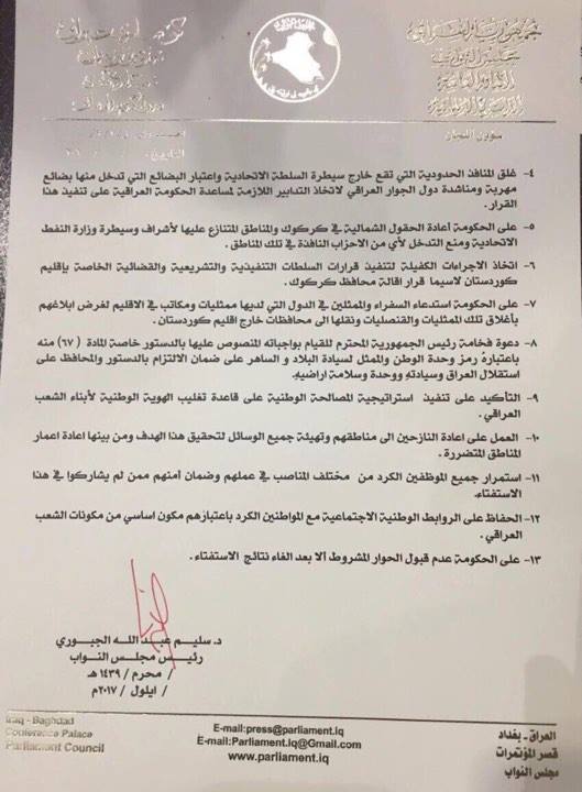 وتظهر الوثيقة إلزام رئيس الوزراء باتخاذ الإجراءات اللازمة لإعادة سيطرة الحكومة الاتحادية على كركوك والمناطق المتنازع عليها وفقاً لما كان عليه الحال قبل 10 حزيران 2014.