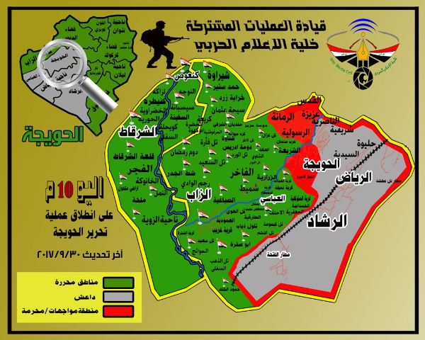 وكان قائد عملية تحرير الحويجة الفريق الركن عبد الأمير رشيد يار الله أعلن، اليوم السبت، تحرير 26 قرية في قضاء الحويجة ورفع العلم العراقي فيها، مؤكدا أن القوات المحررة ما زالت مستمرة بالتقدم.