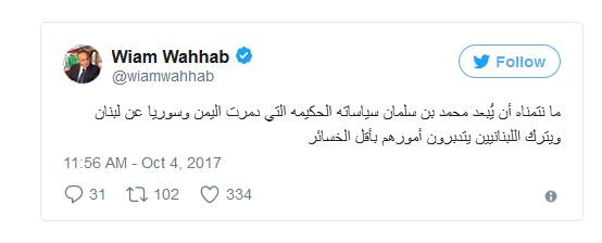 وغرد وهاب عبر صفحته الرسمية على تويتر قائلا "ما نتمناه أن يُبعد محمد بن سلمان سياساته الحكيمة التي دمرت اليمن وسوريا عن لبنان ويترك اللبنانيين يتدبرون أمورهم بأقل الخسائر."