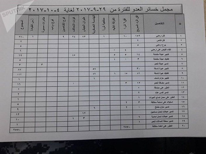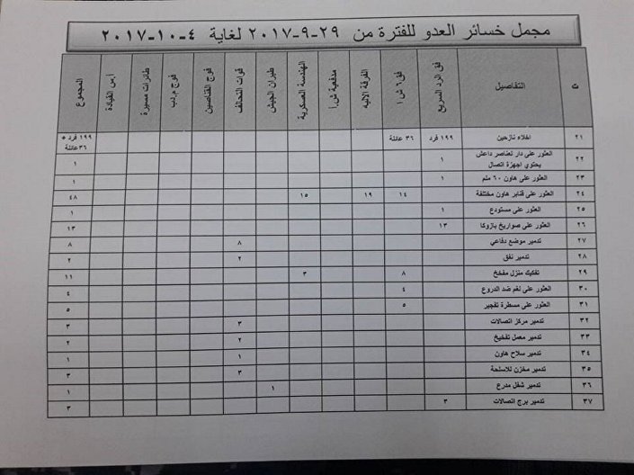 وحسب الوثيقة التي حصلت عرضتها الوکالة الروسية، وحصلت عليها من المكتب الإعلامي للشرطة الاتحادية العراقية، اليوم الخميس، 5 أكتوبر/ تشرين الأول، تم قتل 272 عنصرا من "داعش" الإرهابي أثناء تحرير الحويجة، في الفترة من 29 سبتمبر، وحتى أمس الأربعاء 4 أكتوبر.
