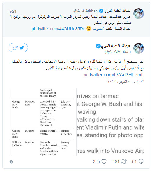 وكان الكاتب الصحفي ورئيس تحرير صحفية “االعرب القطرية” عبد الله العذبة قد كشف كذب هذه الادعاءات، ناشرا عبر حسابه بتويتر برنامج زيارة قديم قام بها الرئيس الأمريكي جورج بوش لموسكو واستقبله خلالها فلاديمير بوتين في المطار.