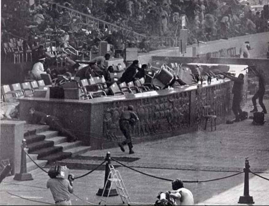 كان السادات قد نهض واقفاً بعد إصابته في عنقه وهو يصرخ، بينما اختفى جميع الحضور أسفل كراسيهم. وتحت ستار الدخان، وجّه الإسلامبولي دفعة طلقات جديدة إلى صدر السادات، في الوقت الذي ألقى فيه كل من عطا طايل بقنبلة ثانية، لم تصل إلى المنصة، ولم تنفجر، وعبد الحميد بقنبلة ثالثة نسي أن ينزع فتيلها فوصلت إلى الصف الأول ولم تنفجر هي الآخرى.