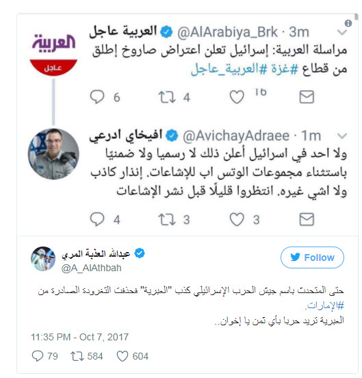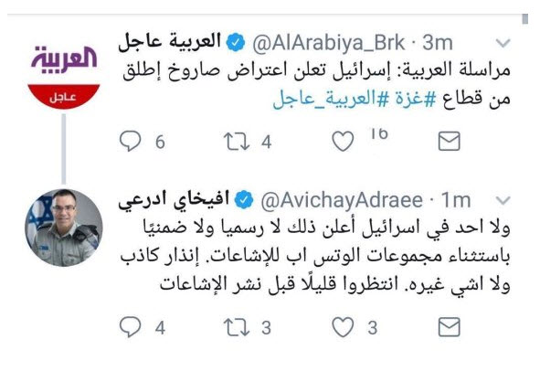 ورد أدرعي على التغريدة، قائلاً: "ولا أحد في "إسرائيل" أعلن ذلك، لا رسمياً ولا ضمنياً، باستثناء مجموعات الواتساب للشائعات".