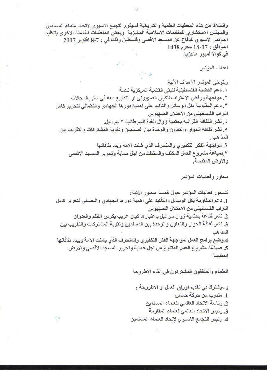 5ـ مواجهة الفكر التكفيري والمنحرف الذي شتت الامة وبدد طاقاتها وصياغة مشروع العمل المكثف والمخطط من أجل حماية وتحرير المسجد الاقصي والارض المقدسة.