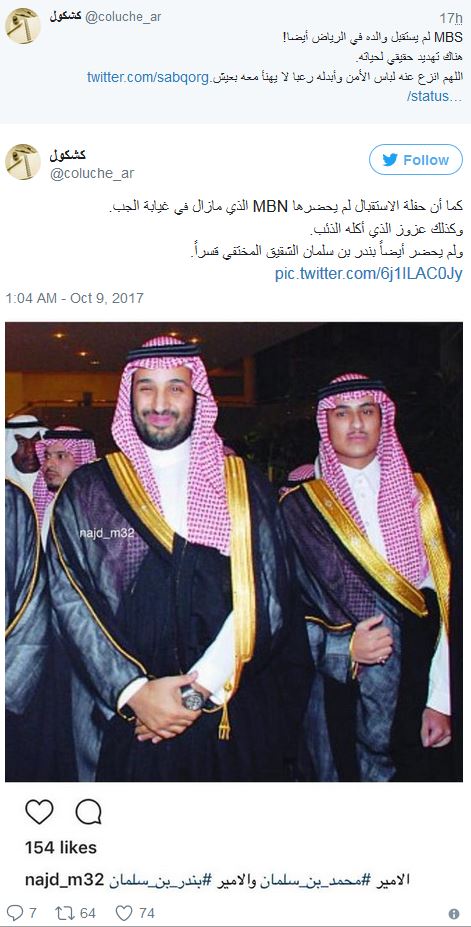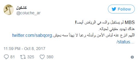 وقال "كشكول" في تدوينات له عبر حسابه على “تويتر” : "MBS لم يستقبل والده في الرياض أيضا! هناك تهديد حقيقي لحياته. اللهم انزع عنه لباس الأمن وأبدله رعبا لا يهنأ معه بعيش".
