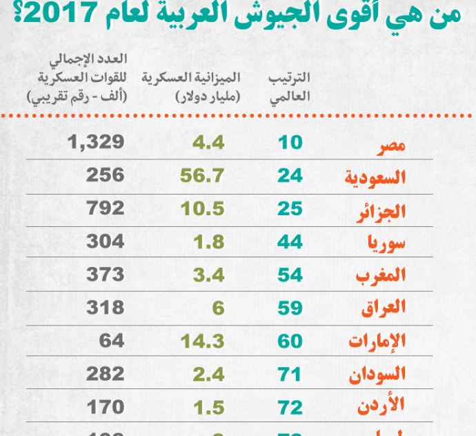 وتصدرت السعودية القائمة العربية في حجم موازنة الدفاع السنوية التي بلغت 56.7 مليار دولار، لكن حجم ميزانية الدفاع السعودية، الكبيرة جداً مقارنة بميزانيات الدول العربية الأخرى لا يجعل المملكة القوة العسكرية الأبرز في المنطقة، إذ حلت القوات المسلحة المصرية في المركز الأول على قائمة الجيوش العربية، وفي المركز العاشر عالمياً (بمؤشر قوة 0.2676)، متقدمة بمركزين عن تصنيف العام الماضي.