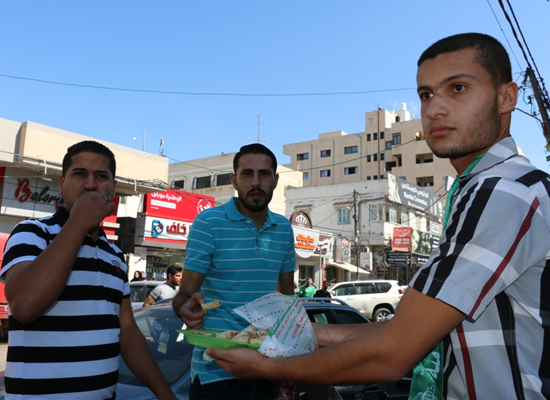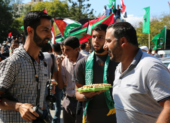 وقامت مجموعة من الشبان الفلسطينيين بتوزيع الحلوى على الجماهير الفلسطينية ابتهاجا باتفاق المصالحة الذي يتمنون أن ينهي 11 عاما من المعاناة.