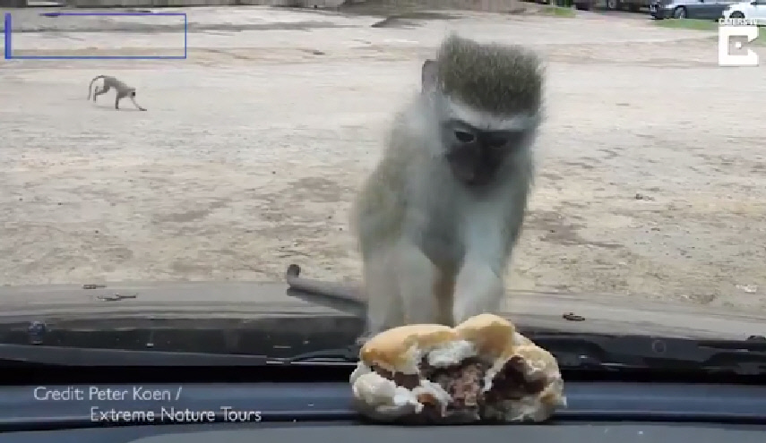 حيث لم يدرك القرد أن الشطيرة موضوع خلف الزجاج الأمامي لسيارة وظل يحارب للوصول إليه محاولا اختراق الزجاج، وعندما فشل قرر الرحيل بعد أن سحب صاحب السيارة الشطيرة.