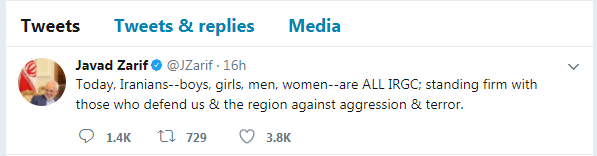 وكتب ظريف، في تغريدة له على صفحته الشخصية في التويتر، ان الايرانيين - بنين وبنات، رجالا ونساء - كلهم حرس ثوري، يقفون مع الذين يدافعون عنا وعن المنطقة امام المعتدين والارهاب.