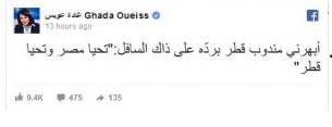 وقالت “عويس”في تدوينة لها عبر حسابها بموقع التواصل الاجتماعي “فيسبوك” مشيدة برد المندوب القطري على هتافات أحد اعضاء الوفد المصري: ” أبهرني مندوب قطر بردّه على ذاك السافل:”تحيا مصر وتحيا قطر”.