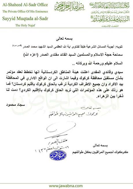 وجاء كلام الصدر رداً على رسالة تلقاها من أحد مؤيديه بتاريخ 1/8/2016 يقول فيها: "إن واقع محافظة كركوك أصبح بيد الكرد، وإنهم يسعون لضمها إلى إقليم كردستان، فما هو رأيكم بهذه المؤتمرات التي تعقد لضم المحافظة إلى الإقليم".