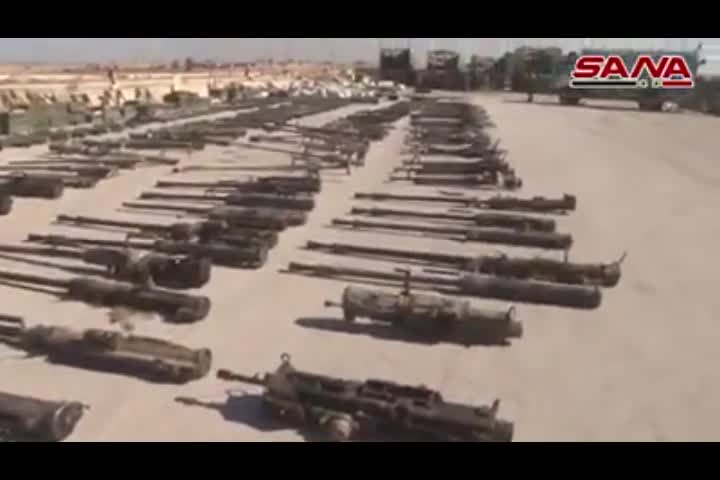 ونشرت وكالة "سانا" مشاهد مصورة لهذه الاسلحة وتبين انها تقدر بالألاف بين اسلحة رشاشة وذخيرة ومدافع ودبابات و مدرعات و قنابل وغيرها.