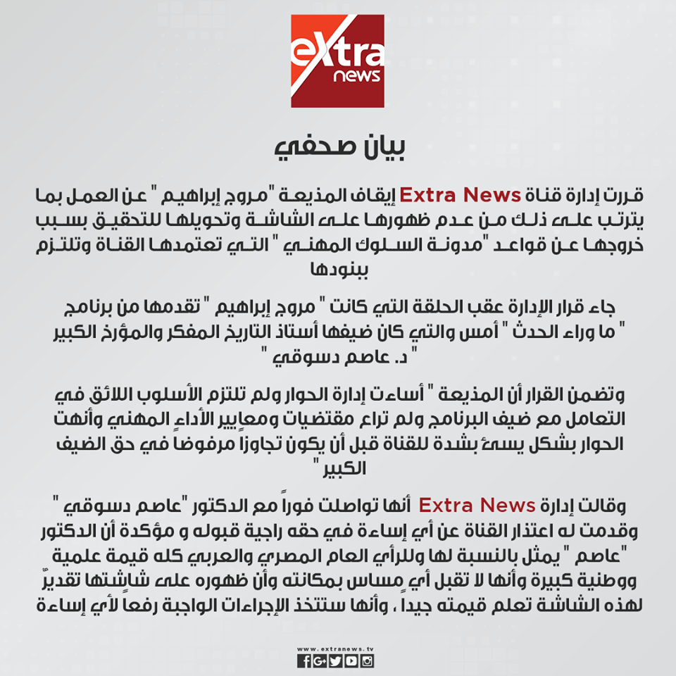 وانفعلت مروج إبراهيم في أثناء حوارها مع الدكتور عاصم الدسوقي أستاذ التاريخ المعاصر، ودخلا في مشادة كلامية على الهواء بخصوص تصريحات المفكر يوسف زيدان عن الزعيم الراحل أحمد عرابي، وأنهت الإعلامية حلقة البرنامج بعد انفعالها على الضيف.