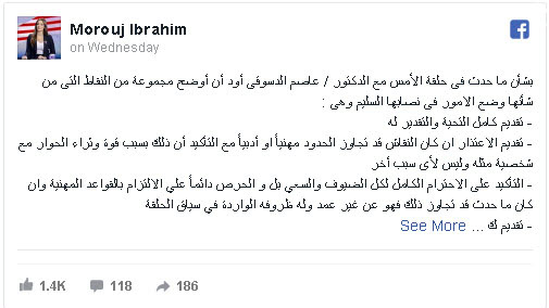 فقاطعته وقالت له: “مع احترامي الكامل لك كنت أحب أن نستفيد من علمك، لكن من الواضح أنك لا تريد أن تكمل الحلقة وهذا أمر يعود لك، وأقول على الهواء نحن كإعلاميين لسنا متخصصين في أي موضوع نناقشه، سواء أكان في مجال الآثار أو التاريخ أو غيره، نحن كإعلاميين لا ندعي العلم ولا المعرفة، وجئنا بأهل العلم ولكنهم لا يريدون أن يعطونا الإجابة."