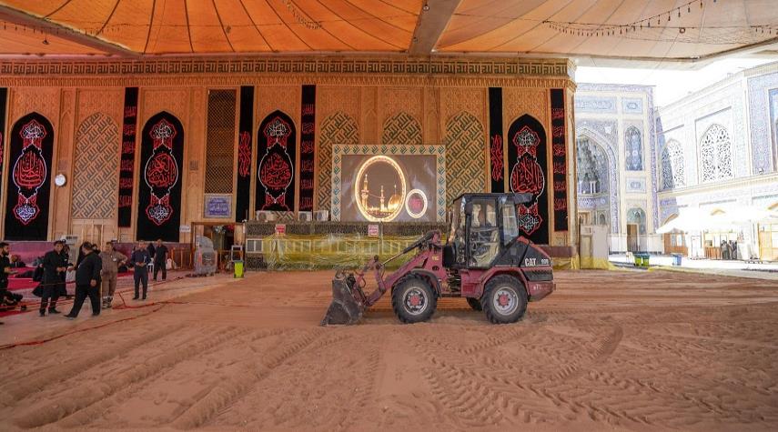 باشرت الكوادر الخدمية في قسم الشؤون الهندسية والفنية أعمالها الميدانية بفرش المحيط الخارجي للصحن الحيدري الشريف المتمثلة بصحن الإمام الحسين (عليه السلام) لإقامة شعيرة حمل المشاعل بمادة الرمل خدمةً للمواكب الحسينية في مدينة النجف الأشرف.