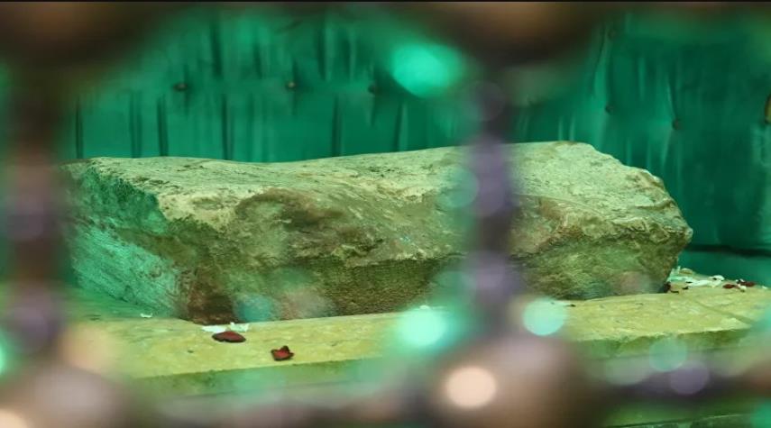 سوريا_الكوثر: أٌعيدت إلى مقام مشهد النقطة (مسجد النقطة) في مدينة حلب السورية، الصخرة التي تحمل قطرات من دماء حفيد رسول الإسلام محمد (ص)، الإمام الحسين (ع)، بحسب الرواية التاريخية في الدين الإسلامي.