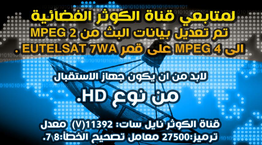 خاص الكوثر: تم تعديل بیانات البث من MPEG_2 الى MPEG_4 على قمر EUTELSAT 7WA .