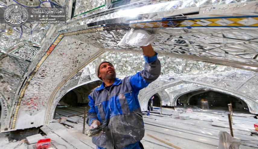 تقرير مصور : أشكال هندسية وأنعكاسات جميلة تصنعها أيدي الفنيين في صحن السيدة فاطمة عليها السلام تمهيداً لافتتاحه بيد لجنة اعمار العتبات المقدسة في العراق